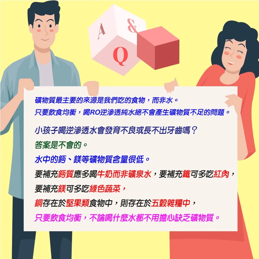 只要 飲食均衡,喝RO逆滲透純水絕不會產生礦物質不足的問題。